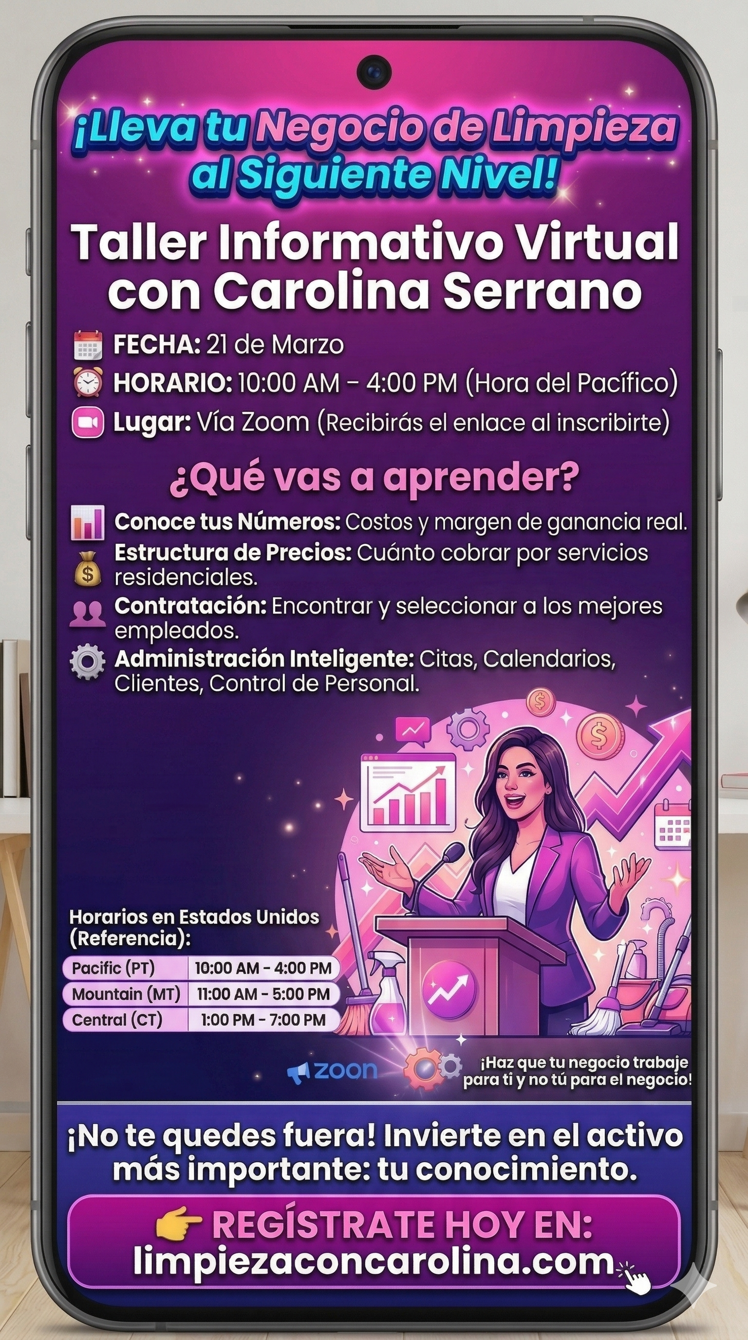 "Hay tantas cosas que me gustaría expresar, pero solo voy a mencionar algunas de ellas. Admiro cómo la Sra. Carolina está ayudando a los recién llegados y a los propietarios actuales de negocios de limpieza a hacer crecer su negocio, incluyéndome a mí. Ella es un ser humano increíble, pero sobre todo es una gran entrenadora. He estado en el negocio durante siete+ años en la industria de la limpieza comercial y en un par de sesiones que tenido las oportunidades de hablar con ella uno en uno, es increíble lo mucho que he aprendido de ella. Ojalá la hubiera conocido hace siete+ años y hubiese obtenido su experiencia, su conocimiento, su orientación, su programa de sistema de CAPE, su podcast, su orientación, sé que mi vida sería mucho más fácil en este negocio, no hubiese perdido tanto dinero, apuesto a que habría alcanzado mi objetivo antes. Muchas gracias Sra. Carolina por compartir con nosotros su conocimiento, experiencia, tiempo, esfuerzo y por darnos orientación para hacer crecer nuestro negocio de limpieza. Sobre todo, gracias por no ser egoísta y guardar su conocimiento para usted misma, lo contrario usted a compartirlo todo con nosotros. "Como le mencioné, usted es increíble, me hace sentir orgullosa de ser una empresaria hispana/latina. En mi mundo usted es uno de los mejores entrenadores que he conocido. Y gracias por toda su ayuda, con su programa de sistema CAPE, su orientación, su podcast, sus videos didácticos de limpieza, su producto, su libro es increíble, una y otra vez muchas gracias, y usted es una de las creaciones más grandes de Dios".."
